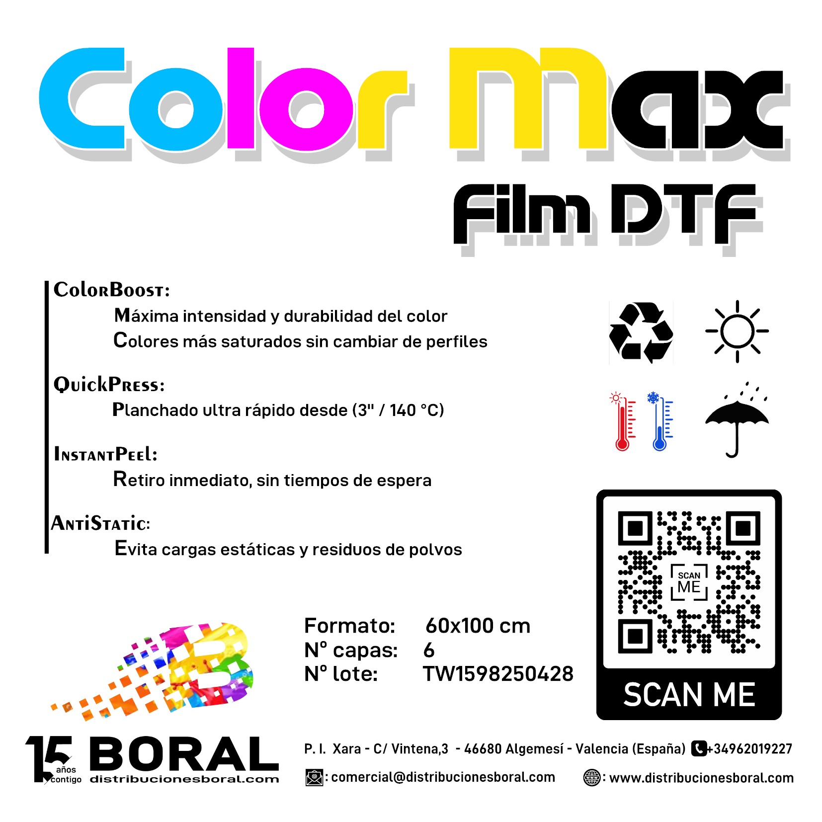 - FILM DTF COLORMAX combina la máxima calidad cromática con la eficiencia operativa que tu negocio necesita. Optimiza tu producción sin comprometer resultados.