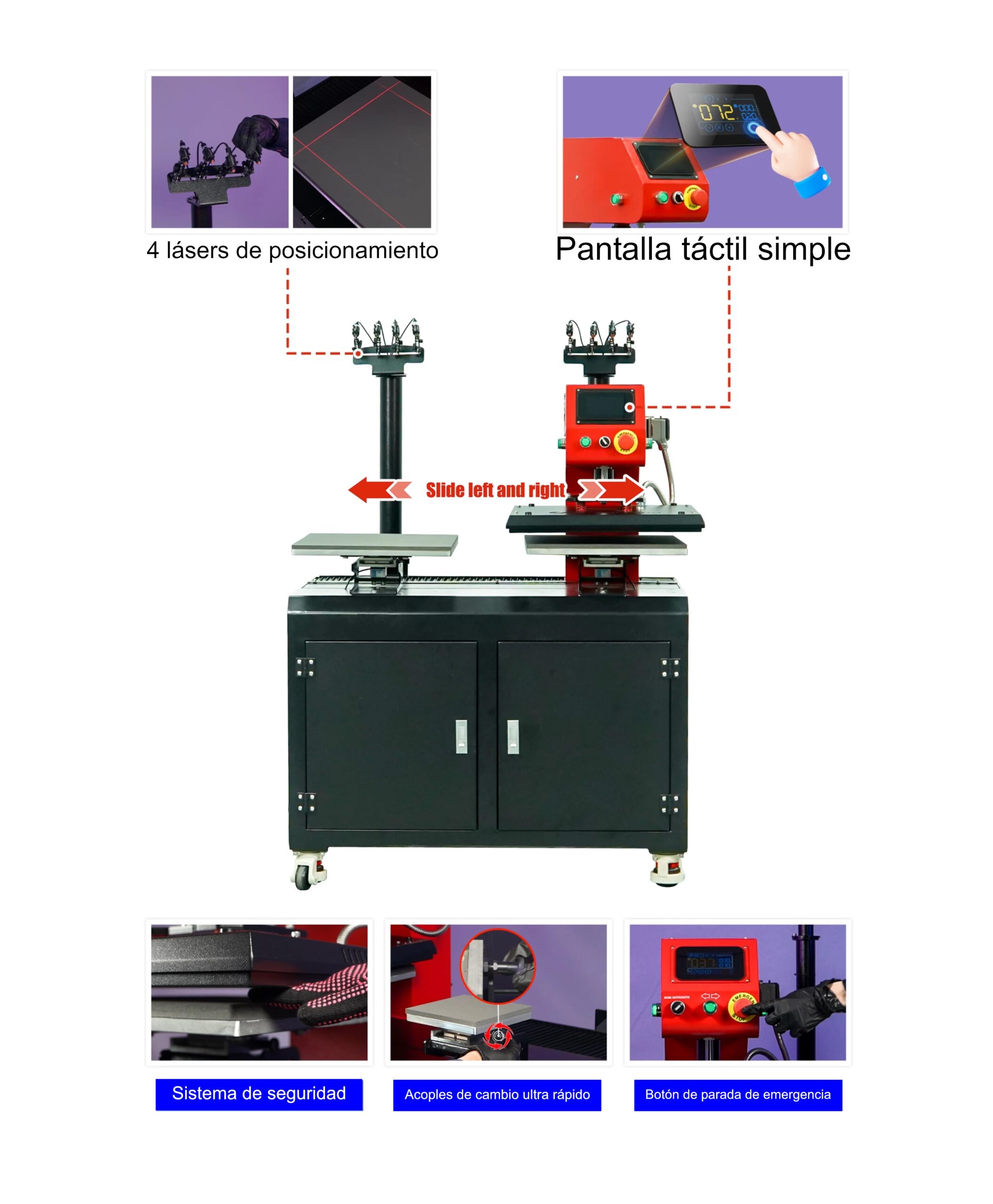 volumen. Diseñada con precisión, velocidad y eficiencia, esta prensa térmica avanzada es ideal para empresas de impresión bajo demanda, decoradores de ropa deportiva e impresores de ropa personalizada que buscan optimizar su capacidad de producción en un espacio reducido y sin las molestas arrancadas y paradas de un compresor de aire.